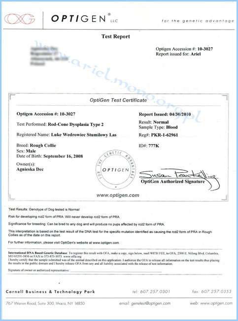 Registered Name: Luke Wedrowiec Stumilowy Las Registration #: PKR-1-62961 Tattoo/Chip #: 777K Call Name: Ariel Breed: Rough Collie Date of Birth: September 16, 2008 Gender: Male Optigen Accession #: 10-3027 Test Performed: Rod-Cone Dysplasia Type 2 Sample Type: Blood Test Results: Genotype of Dog tested is Normal Risk for developing rcd2 form of PRA: Will never develop rcd2 form of PRA. Significance for breeding: Can be bred to any dog and will produce no pups affected by rcd2 form of PRA. This interpretation is based on the test result of the DNA test for the specific mutation identified as causing the rcd2 form of PRA in Rough Collies as of the date on this report. For further information, please visit OptiGen's website at www.optigen.com. OptiGen, LLC Cornell Business & Technology Park 767 Warren Road, Suite 300, Ithaca, New York 14850 Tel: 607 257 0301 Fax: 607 257 0353