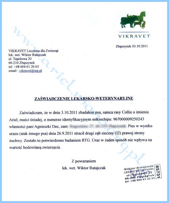 26.09.2011 na skutek ataku drugiego psa Ariel stracił ząb.