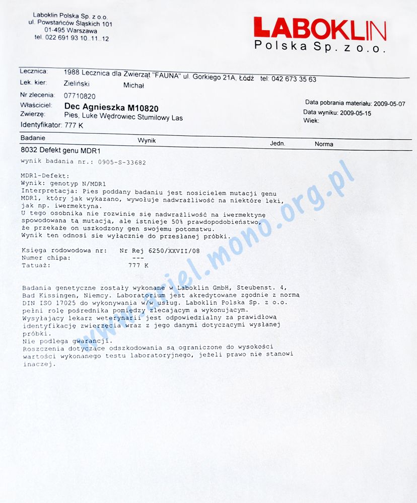 Wynik testu w kierunku defektu genu MDR-1: nosiciel ( + / - )