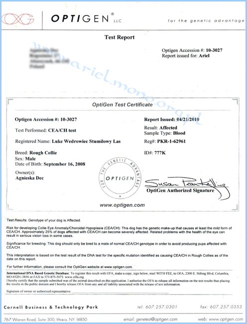 Registered Name: Luke Wedrowiec Stumilowy Las Registration #: PKR-1-62961 Tattoo/Chip #: 777K Call Name: Ariel Breed: Rough Collie Date of Birth: September 16, 2008 Gender: Male Optigen Accession #: 10-3027 Test Performed: CEA/CH test Sample Type: Blood Test Results: Genotype of your dog is Affected. Risk for developing Collie Eye Anomaly/Choroidal Hypoplasia (CEA/CH): This dog has the genetic make-up that causes at least the mild form of CEA/CH. Approximately 25% of dogs affected with CEA/CH can become severely affected. Related problems with the health of the eye can result in serious vision loss in some cases. Significance for breeding: This dog should only be bred to a mate of normal CEA/CH genotype in order to avoid producing pups affected with CEA/CH. This interpretation is based on the test result of the DNA test for the specific mutation identified as causing CEA/CH in Rough Collies as of the date on this report. For further information, please consult the OptiGen website at www.optigen.com. OptiGen, LLC Cornell Business & Technology Park 767 Warren Road, Suite 300, Ithaca, New York 14850 Tel: 607 257 0301 Fax: 607 257 0353